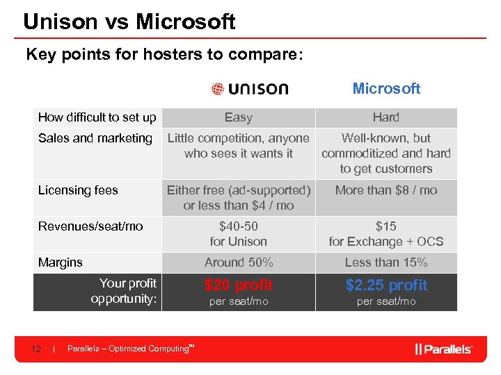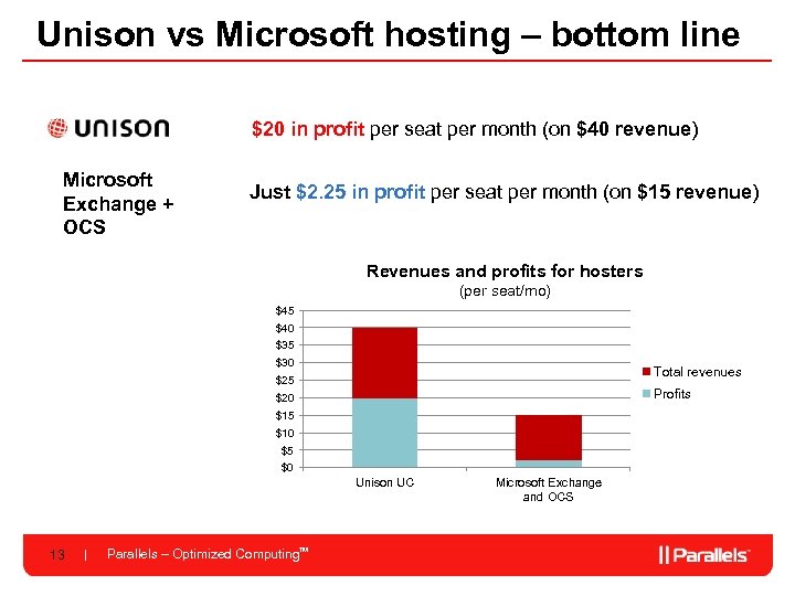 Unison vs Microsoft Key points for hosters to compare: Microsoft How difficult to set up Easy Hard Sales and marketing Little competition, anyone Well-known, but who sees it wants it commoditized and hard to get customers Licensing fees Either free (ad-supported) or less than $4 / mo More than $8 / mo $40 -50 for Unison $15 for Exchange + OCS Around 50% Less than 15% $20 profit $2. 25 profit per seat/mo Revenues/seat/mo Margins Your profit opportunity: 12 Parallels – Optimized Computing. TM