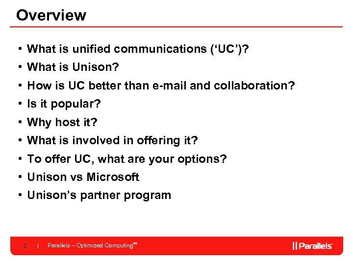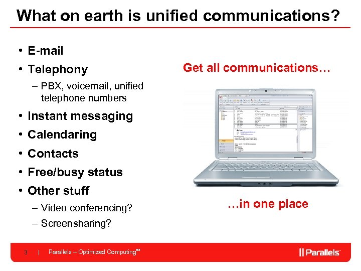Overview • What is unified communications (‘UC’)? • What is Unison? • How is UC better than e-mail and collaboration? • Is it popular? • Why host it? • What is involved in offering it? • To offer UC, what are your options? • Unison vs Microsoft • Unison’s partner program 2 Parallels – Optimized Computing. TM