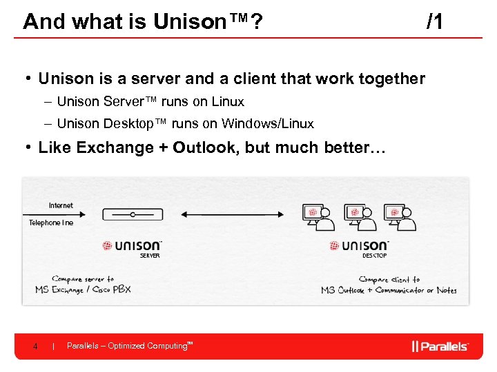 What on earth is unified communications? • E-mail • Telephony Get all communications… – PBX, voicemail, unified telephone numbers • Instant messaging • Calendaring • Contacts • Free/busy status • Other stuff – Video conferencing? – Screensharing? 3 Parallels – Optimized Computing. TM …in one place