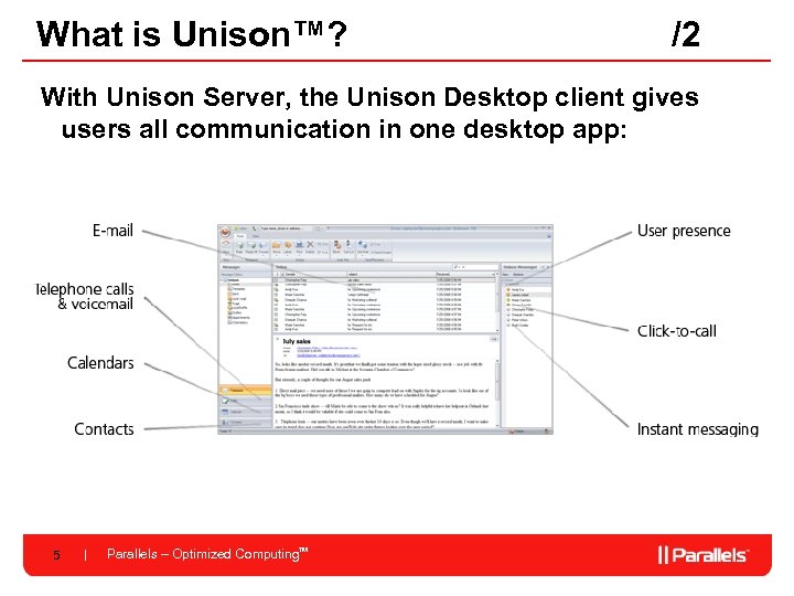And what is Unison™? • Unison is a server and a client that work together – Unison Server™ runs on Linux – Unison Desktop™ runs on Windows/Linux • Like Exchange + Outlook, but much better… 4 Parallels – Optimized Computing. TM /1