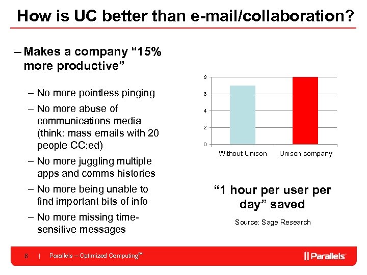 How is UC better than e-mail/collaboration? – Makes a company “ 15% more productive” 8 – No more pointless pinging – No more abuse of communications media (think: mass emails with 20 people CC: ed) – No more juggling multiple apps and comms histories – No more being unable to find important bits of info – No more missing timesensitive messages 6 Parallels – Optimized Computing. TM 6 4 2 0 Without Unison company “ 1 hour per user per day” saved Source: Sage Research