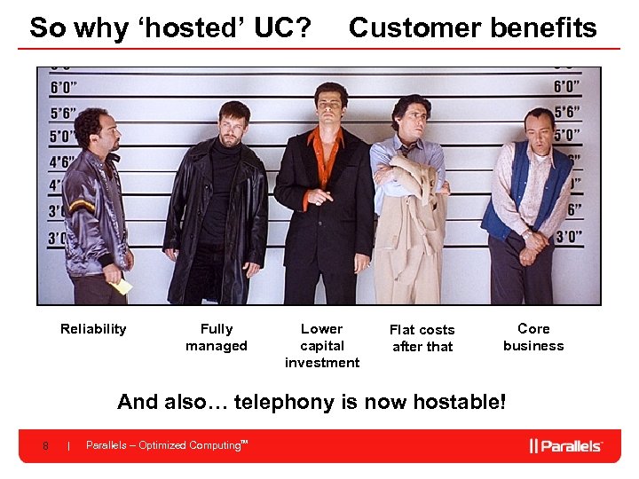 Is UC popular? • Not yet common among SMBs • A majority of enterprises testing UC (per Microsoft) – SMBs will want it too – EVERYONE wants it when they see it • Hosted UC growth of 355% from 2007 -11 (per Radicati) – But just 45% for e-mail and collaboration • Fast approaching a ‘hockey stick’ upward curve: Today, we are here 7 Parallels – Optimized Computing. TM