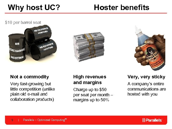 So why ‘hosted’ UC? Reliability Fully managed Customer benefits Lower capital investment Flat costs after that Core business And also… telephony is now hostable! 8 Parallels – Optimized Computing. TM