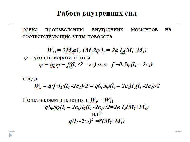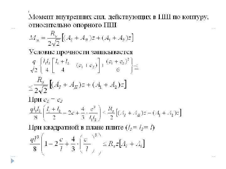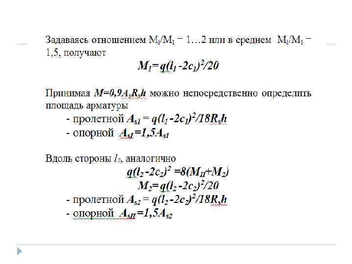 Инструкция ЦНИИПСа 1933 года, авторы А. А. Гвоздев и В. И. Мурашев Для квадратной панели балочный момент M 0=1/8 WL(1 -2 c/3 L). W – суммарная нагрузка на плиту L – пролет плиты, с – вылет капители