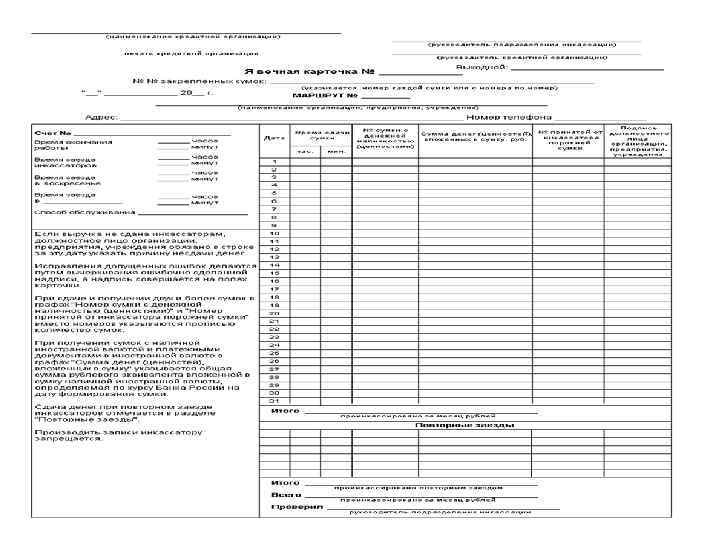 Кассовым работникам запрещается: - передоверять выполнение порученной работы с ценностями другим лицам, а также выполнять работу, не входящую в круг их обязанностей; - выполнять поручения клиентов по проведению операций с денежной наличностью по их счетам, минуя бухгалтерских работников при отсутствии вышеуказанной системы контроля; - хранить свои деньги и другие ценности вместе с деньгами и ценностями кредитной организации.