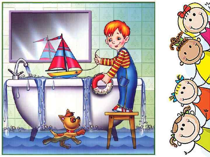 • Не баловаться с водой, не набирать самостоятельно ванну. • В чрезвычайных ситуациях (пожар, землетрясение и т. п. ) действовать согласно правилам безопасности, с которыми ребенок должен быть уже хорошо знаком.