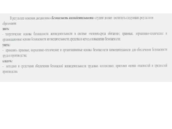 Электронные и иные ресурсы по дисциплине на сайте института: 1. Конспекты лекций по БЖД. 2. И. Б. ЧМИЛЬ, А. Ю. АНДРЕЕВ, А. О. УРБАЕВ. ЛАБОРАТОРНЫЙ ПРАКТИКУМ ПО БЖД. Учебное пособие. Ч. 1 -2. Изд-во Кр. ИЖТ, 2010. 3. Вопросы к экзамену. 1. 2. 3. 4. иные ресурсы: Учебные стенды и оборудование в лаборатории Литературные источники в библиотеке института Видеоматериал для подготовки к лабораторно-практическим занятиям в лаборатории. Интернет-ресурсы.
