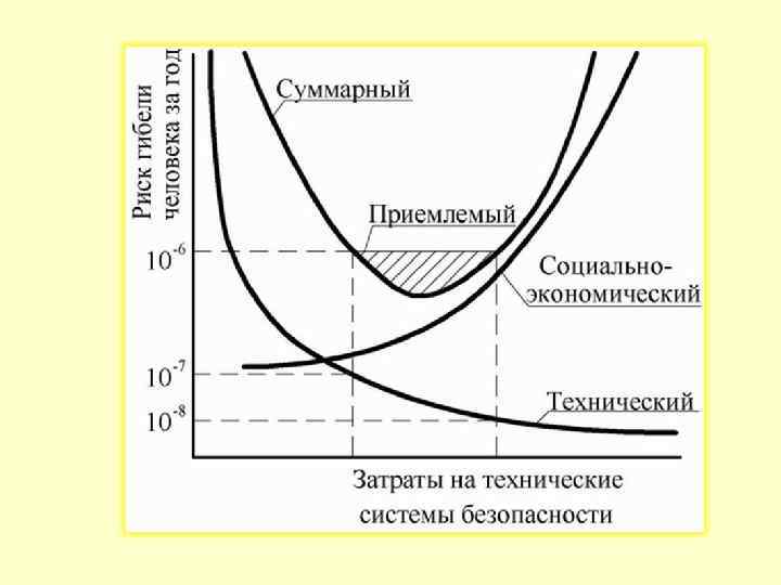 Приемлемый риск - это такая частота реализации опасностей, которая сочетает в себе технические, экономические, экологические и социальные аспекты и представляет собой компромисс между уровнем безопасности и возможностями общества по её достижению на данный период времени. При увеличении затрат на техническую, природную и экологическую безопасности риск снижается, но может возрасти риск в социальной сфере, так как будет ощущаться нехватка средств на медицинскую помощь, на охрану и на оздоровление населения. Суммарный риск Rсум. имеет минимум при определённом соотношении между инвестициями в техническую и социальную сферы. Эта величина принимается за «приемлемый риск» .