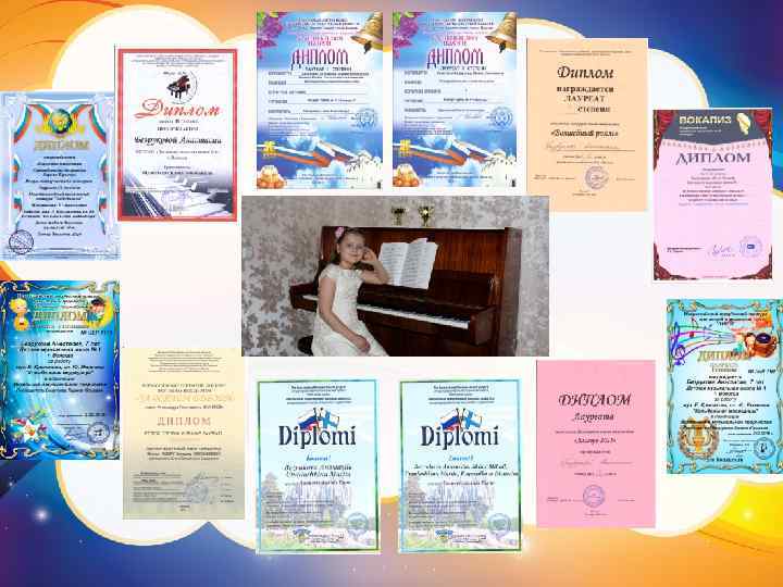 Творческие достижения в 2015 – 2016 учебном году: ØЛауреат школьного фестиваля юных пианистов «Аллегро – 2015» ØЛауреат I степени школьного конкурса юных пианистов «Волшебный рояль» ØЛауреат II степени всероссийского вокально-музыкального конкурса «Вокализ» в номинации «композиция» ØЛауреат II степени областного конкурса юных пианистов «Allegro – 2015» ØЛауреат III степени Международного творческого конкурса «Победилкин» в номинации «Я – музыкант» ( вокал) ØЛауреат I степени Всероссийского творческого конкурса для детей и педагогов «Созвездие талантов» (вокал) ØЛауреат I степени Всероссийского творческого конкурса для детей и педагогов «Лира» (вокал) ØЛауреат II степени Всероссийского открытого конкурса фортепианных дуэтов «За роялем вдвоём» им. А. Г. Бахчиева ØЛауреат I степени Всероссийского конкурса-фестиваля искусств «Малиновый звон пасхи» в номинации «фортепианный дуэт» ØЛауреат I степени Всероссийского конкурса-фестиваля искусств «Малиновый звон пасхи» в номинации «фортепианный квартет» ØЛауреат I степени Международного конкурса музыкантов и художников «Финские истории» в номинации «фортепианный дуэт» ( г. Лаппеенранта, Финляндия) ØЛауреат I степени Международного конкурса музыкантов и художников «Финские истории» в номинации «фортепианный квартет» ( г. Лаппеенранта, Финляндия)