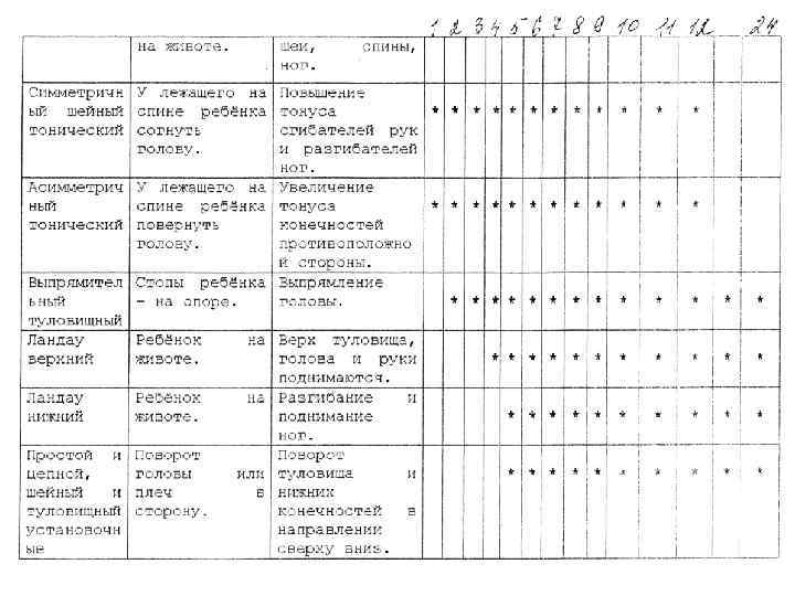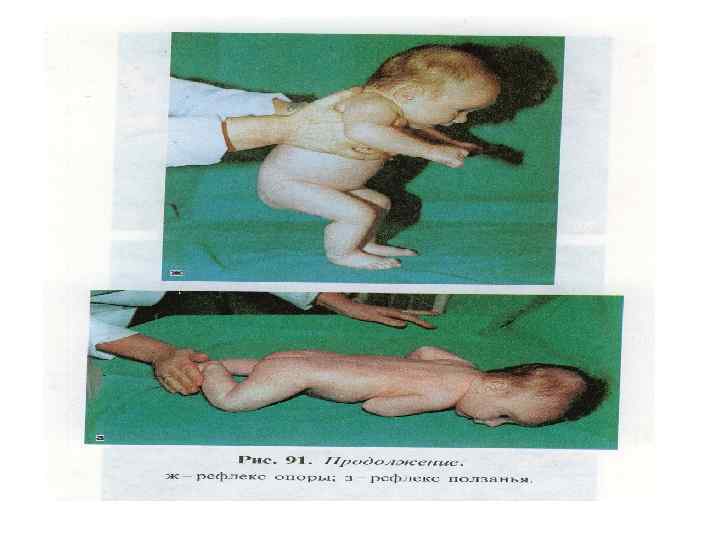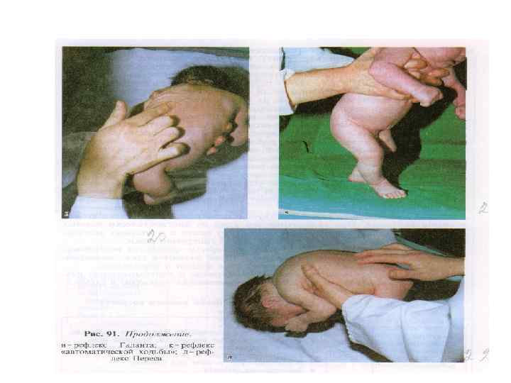 Ко второй группе относят следующие рефлексы: - спинальные сегментарные автоматизмы - хватательный рефлекс, рефлекс Моро, опоры, автоматической походки, ползания, рефлексы Таланта, Переса; - оральные сегментарные автоматизмы - сосательный, поисковый, хоботковый и ладонно-ротовой рефлексы; - миелоэнцефалъные позотонические рефлексы - лабиринтный тонический рефлекс, асимметричный шейный тонический рефлекс, симметричный шейный тонический рефлекс.
