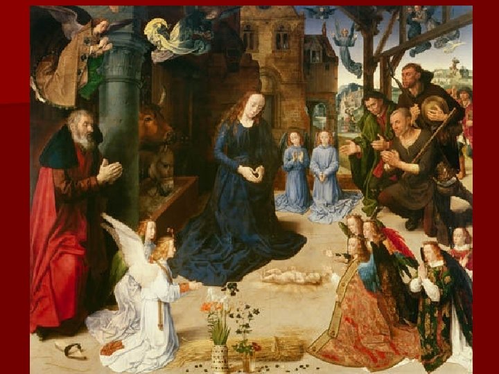 Хуго Гус Алтарь Портинари. « Рождество» ([1473 -1482) n Сцена основана на Евангелии от Луки: Иосиф отправляется из своего родного города Вифлеема для участия в переписи. На заднем плане левой створки он идет по горной тропе, ведя ослика и поддерживая свою беременную жену Марию. n Прибыв в Вифлеем, она рожает ребенка в хлеву. Небесный ангел является находящимся поблизости пастухам и сообщает им о радостном событии. n Ван дер Гус раскрывает тему с изображением практически всех деталей, добавленных с XIII века теологами, мистиками, апокрифическими Евангелиями и преданиями.