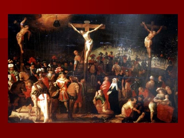 Несение креста После того как Иисус был предан на распятие, солдаты взвалили на Него тяжелый крест и повели на лобное место, называемое Голгофой. По дороге они схватили Симона из Киринеи, который возвращался домой с поля, и заставили его нести крест за Иисуса. За Иисусом шло множество людей, среди них были женщины, плакавшие и рыдавшие о Нем. Иисус повернулся к ним и сказал: «Дочери Иерусалима, не плачьте обо Мне, плачьте лучше о себе и своих детях. Наступит такое время, когда бездетных будут считать счастливыми. Тогда люди будут говорить горам: «Упадите на нас» и холмам: «Покройте нас» . Ведь если с молодым и зеленым деревом делают такое, то что же будет с сухим? » n С Иисусом на казнь вели еще двоих людей — разбойников. Они пришли на Голгофу, и там Иисуса распяли. Разбойников тоже распяли вместе с Ним, одного по правую сторону, а другого — по левую (по Евангелию от Луки). n