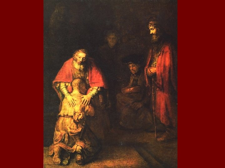 Харменс-ван-Рейн Рембрандт n «Возвращение блудного сына» [1668 -1669] В притче рассказывается о некоем молодом человеке, который, получив от отца причитающуюся ему долю наследства, промотал ее и после долгих мытарств вернулся домой, где был прощен отцом. Художник выбирает для изображения тот момент, когда чувства героев напряжены до предела. Сын, испытавший все беды в жизни, глубоко раскаявшийся и не уверенный в отцовском прощении, подходит к старику и падает перед ним на колени; отец наклоняется над ним и ощупывает его плечи дрожащими руками. Большая часть полотна погружена в полумрак из которого на первый план выдвинута лишь главная группа: стоящий на коленях сын в грязных лохмотьях и склонившийся над ним старец в красном плаще. Постепенно зритель замечает, что в картине есть и другие персонажи: справа стоит бородатый мужчина с посохом из тени выступают фигуры сидящего мужчины и женщины. Они смотрят на происходящую сцену с любопытством, но спокойно, может быть, даже несколько отчужденно. Проявляемые ими чувства, в сущности, малозначительны по сравнению с той возвышенной и напряженной до предела эмоциональностью, которую художник воплощает в двух главных фигурах.