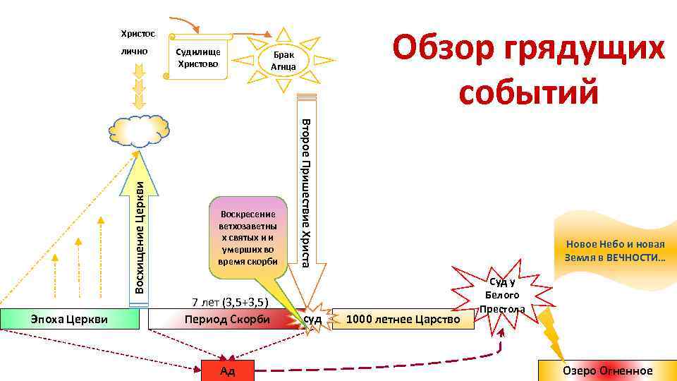 Обзор грядущих событий Христос Эпоха Церкви Судилище Христово Брак Агнца Воскресение ветхозаветны х святых и и умерших во время скорби 7 лет (3, 5+3, 5) Период Скорби Ад Второе Пришествие Христа Восхищение Церкви лично суд Новое Небо и новая Земля в ВЕЧНОСТИ… 1000 летнее Царство Суд у Белого Престола Озеро Огненное