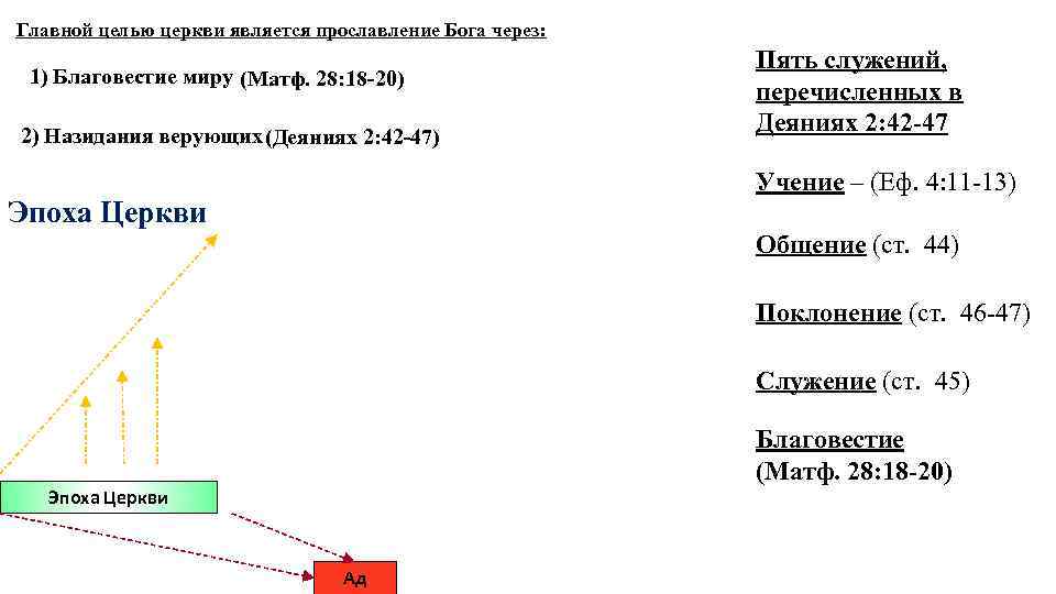 Главной целью церкви является прославление Бога через: 1) Благовестие миру (Матф. 28: 18 -20) 2) Назидания верующих (Деяниях 2: 42 -47) Пять служений, перечисленных в Деяниях 2: 42 -47 Учение – (Еф. 4: 11 -13) Эпоха Церкви Общение (ст. 44) Поклонение (ст. 46 -47) Служение (ст. 45) Благовестие (Матф. 28: 18 -20) Эпоха Церкви Ад
