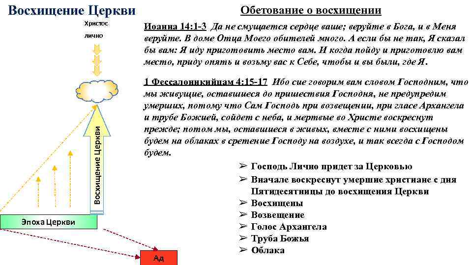 Восхищение Церкви Христос Восхищение Церкви лично Эпоха Церкви Обетование о восхищении Иоанна 14: 1 -3 Да не смущается сердце ваше; веруйте в Бога, и в Меня веруйте. В доме Отца Моего обителей много. А если бы не так, Я сказал бы вам: Я иду приготовить место вам. И когда пойду и приготовлю вам место, приду опять и возьму вас к Себе, чтобы и вы были, где Я. 1 Фессалоникийцам 4: 15 -17 Ибо сие говорим вам словом Господним, что мы живущие, оставшиеся до пришествия Господня, не предупредим умерших, потому что Сам Господь при возвещении, при гласе Архангела и трубе Божией, сойдет с неба, и мертвые во Христе воскреснут прежде; потом мы, оставшиеся в живых, вместе с ними восхищены будем на облаках в сретение Господу на воздухе, и так всегда с Господом будем. ➢ Господь Лично придет за Церковью ➢ Вначале воскреснут умершие христиане с дня Пятидесятницы до восхищения Церкви ➢ Восхищены ➢ Возвещение ➢ Голос Архангела ➢ Труба Божья ➢ Облака Ад