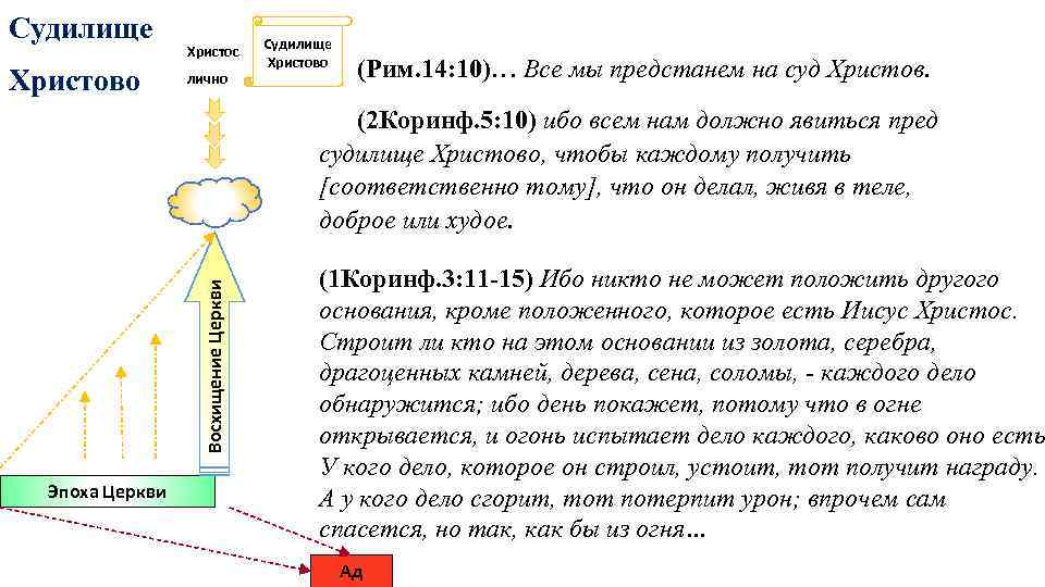 Судилище Христово Христос лично Судилище Христово (Рим. 14: 10)… Все мы предстанем на суд Христов. Восхищение Церкви (2 Коринф. 5: 10) ибо всем нам должно явиться пред судилище Христово, чтобы каждому получить [соответственно тому], что он делал, живя в теле, доброе или худое. Эпоха Церкви (1 Коринф. 3: 11 -15) Ибо никто не может положить другого основания, кроме положенного, которое есть Иисус Христос. Строит ли кто на этом основании из золота, серебра, драгоценных камней, дерева, сена, соломы, - каждого дело обнаружится; ибо день покажет, потому что в огне открывается, и огонь испытает дело каждого, каково оно есть У кого дело, которое он строил, устоит, тот получит награду. А у кого дело сгорит, тот потерпит урон; впрочем сам спасется, но так, как бы из огня… Ад