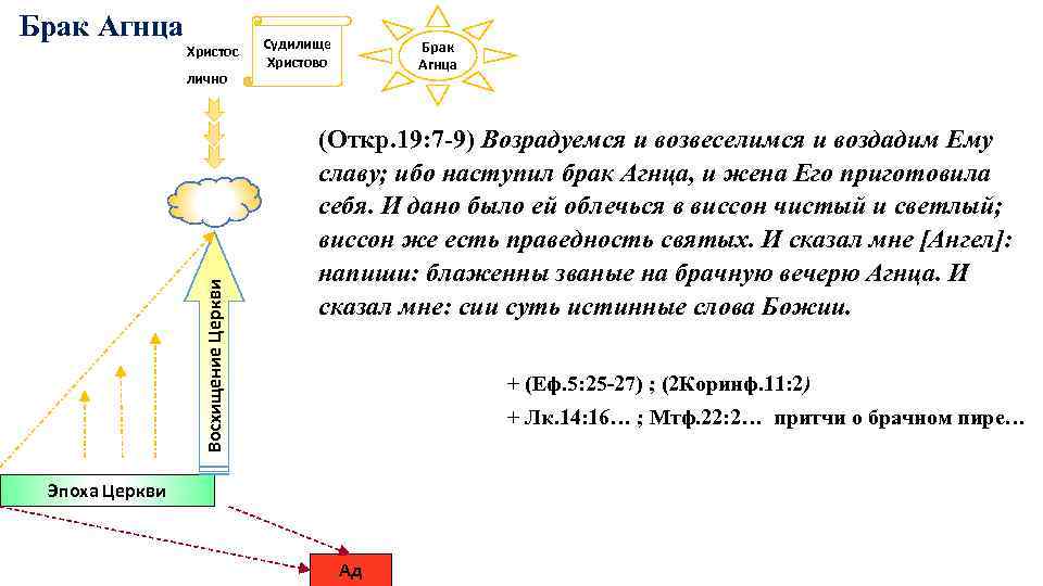 Брак Агнца Христос Восхищение Церкви лично Судилище Христово Брак Агнца (Откр. 19: 7 -9) Возрадуемся и возвеселимся и воздадим Ему славу; ибо наступил брак Агнца, и жена Его приготовила себя. И дано было ей облечься в виссон чистый и светлый; виссон же есть праведность святых. И сказал мне [Ангел]: напиши: блаженны званые на брачную вечерю Агнца. И сказал мне: сии суть истинные слова Божии. + (Еф. 5: 25 -27) ; (2 Коринф. 11: 2) + Лк. 14: 16… ; Мтф. 22: 2… притчи о брачном пире… Эпоха Церкви Ад