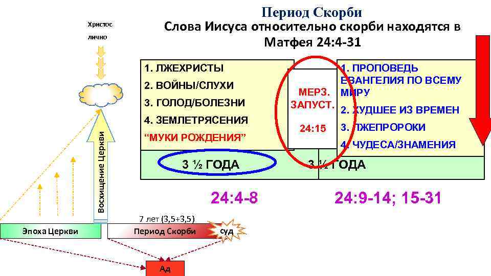 Христос лично Период Скорби Слова Иисуса относительно скорби находятся в Матфея 24: 4 -31 1. ПРОПОВЕДЬ ЕВАНГЕЛИЯ ПО ВСЕМУ МИРУ 1. ЛЖЕХРИСТЫ 2. ВОЙНЫ/СЛУХИ 3. ГОЛОД/БОЛЕЗНИ Восхищение Церкви 4. ЗЕМЛЕТРЯСЕНИЯ Эпоха Церкви “МУКИ РОЖДЕНИЯ” 3 ½ ГОДА 24: 4 -8 7 лет (3, 5+3, 5) Период Скорби Ад суд МЕРЗ. ЗАПУСТ. 2. ХУДШЕЕ ИЗ ВРЕМЕН 24: 15 3. ЛЖЕПРОРОКИ 4. ЧУДЕСА/ЗНАМЕНИЯ 3 ½ ГОДА 24: 9 -14; 15 -31