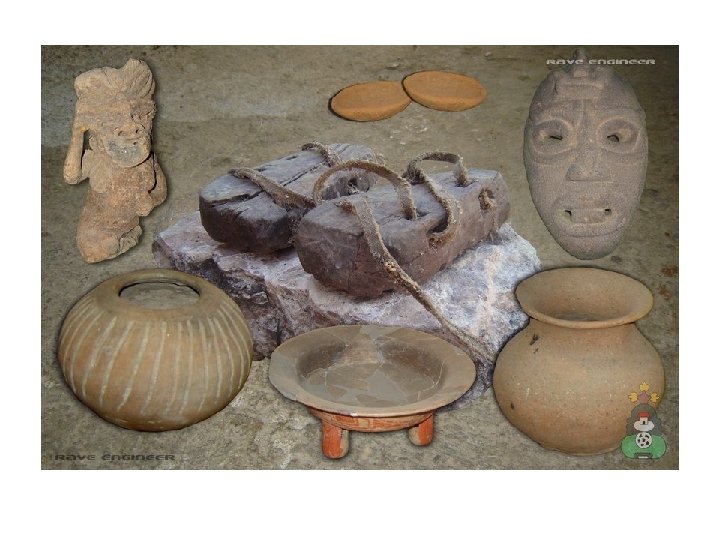Objetos que aparecen comúnmente • • • La alfarería es el elemento que aparece constantemente: cántaros, vasos de mano, marmitas para cocinar, cráteras, cuencos, platos, copas, cubiletes, lámparas, vasijas, etc. Objetos de piedra, de metal (pocos porque se refundían el bronce y el hierro). Figurillas con forma humana o de animales. Objetos escritos: éstos son poco numerosos. Pueden estar escritos en fragmentos de cerámica (ostracas). También sellos, bulas, etc. Monedas: se extienden a partir del siglo V a. C. y permiten precisar la duración de una ocupación.