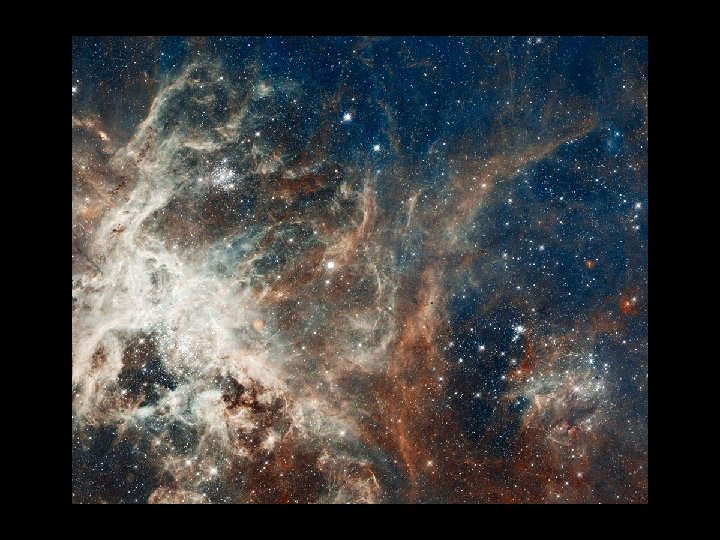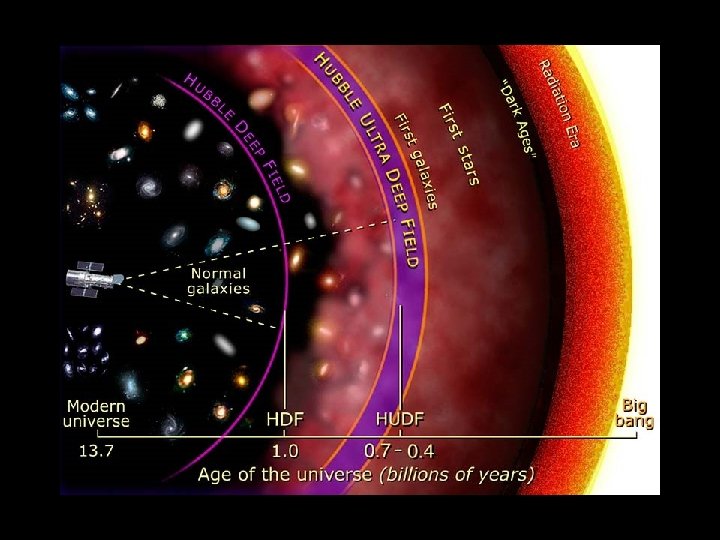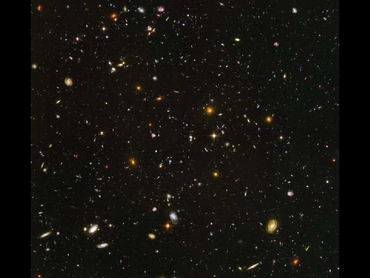 Next slide is a Hubble deep space photograph multiple (~800) time exposures taken over 11. 3 days into a small, black portion of space in 2004. Peering into this ultra deep field, is roughly equivalent to looking through an 8 foot long soda straw. 10, 000 galaxies billions of light years away.