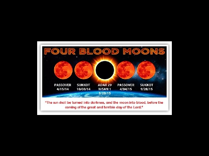 Eclipses Of Prophetic Significance -When an eclipse (sign) occurs on a Biblical Feast day (season) according to God’s calendar. These have proven historically to have prophetic significant. -When a series of eclipses (solar and lunar) occur on a series of Feast days, there is a much higher statistical improbability for their occurrence. -a tetrad is the occurrence of four simultaneous eclipses, considered here, the tetrads ONLY occur on feast days.