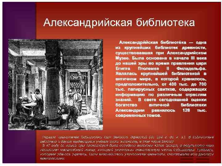 БИБЛИОГРАФИЯ (ДРЕВНЕГРЕЧ. ) КНИГООПИСАНИЕ • Развитие библиографии началось с развитием книгопечатания (книгопечатание появилось в Западной Европе в середине 15 в. , на Руси в середине 16 в. ) • Зачатки библиографии можно найти в библиотечных каталогах античности: каталог Александрийской библиотеки, составленный ученым Каллимахом (3 -4 вв. до н. э. ), каталоги знаменитой библиотеки ассирийского царя Ашшурбанипала (7 в. до н. э. )