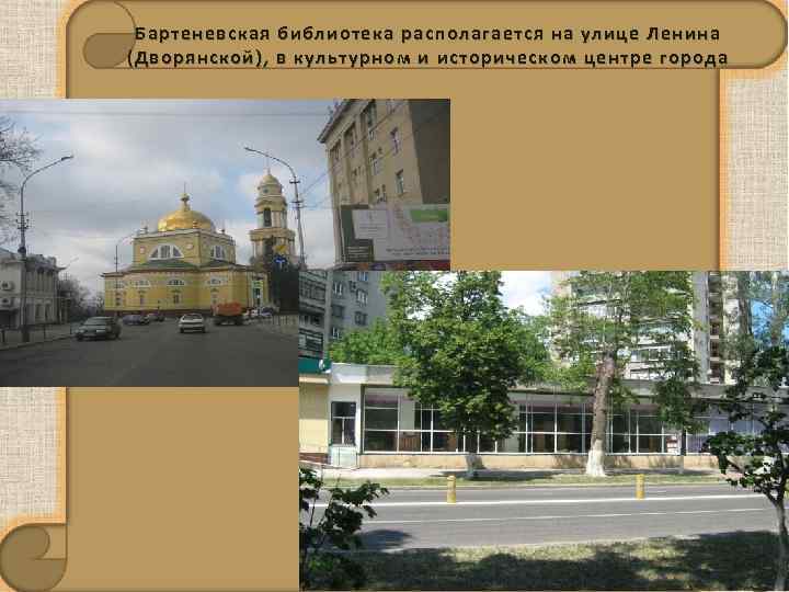 Бартеневская библиотека располагается на улице Ленина (Дворянской), в культурном и историческом центре города