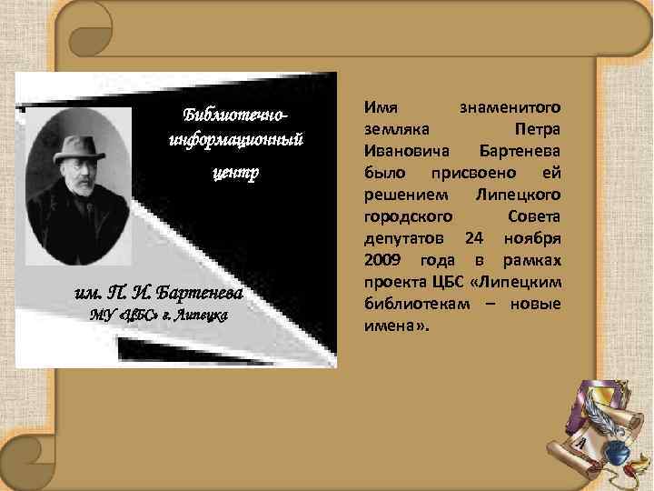 Библиотечноинформационный центр им. П. И. Бартенева МУ «ЦБС» г. Липецка Имя знаменитого земляка Петра Ивановича Бартенева было присвоено ей решением Липецкого городского Совета депутатов 24 ноября 2009 года в рамках проекта ЦБС «Липецким библиотекам – новые имена» .