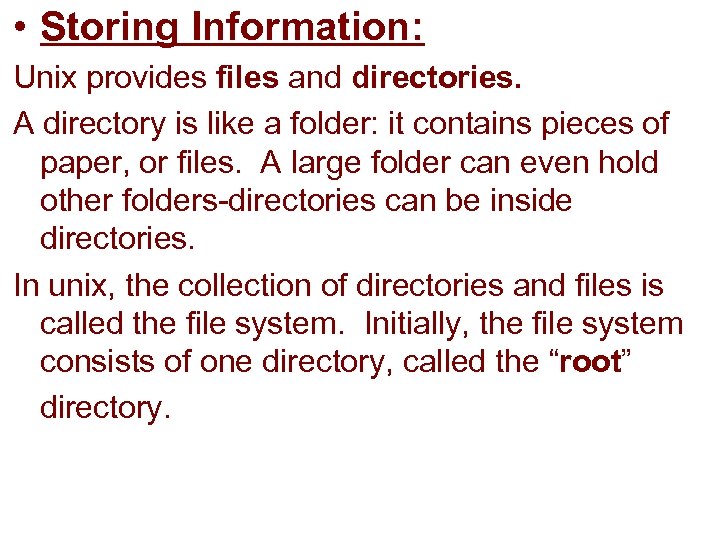 • Storing Information: Unix provides files and directories. A directory is like a folder: it contains pieces of paper, or files. A large folder can even hold other folders-directories can be inside directories. In unix, the collection of directories and files is called the file system. Initially, the file system consists of one directory, called the “root” directory.