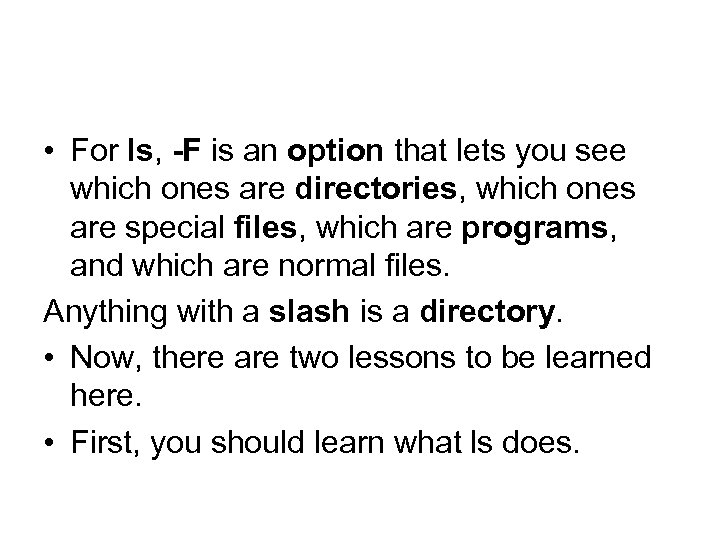 • For ls, -F is an option that lets you see which ones are directories, which ones are special files, which are programs, and which are normal files. Anything with a slash is a directory. • Now, there are two lessons to be learned here. • First, you should learn what ls does.