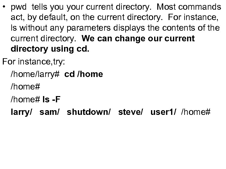 • pwd tells your current directory. Most commands act, by default, on the current directory. For instance, ls without any parameters displays the contents of the current directory. We can change our current directory using cd. For instance, try: /home/larry# cd /home# ls -F larry/ sam/ shutdown/ steve/ user 1/ /home#