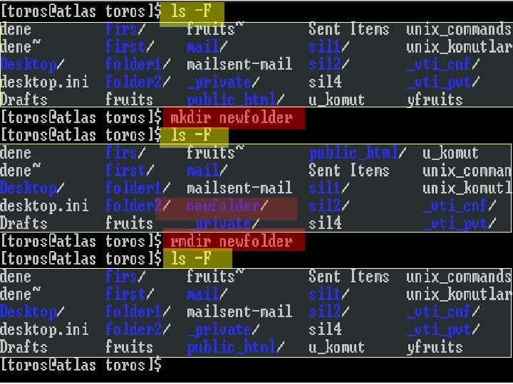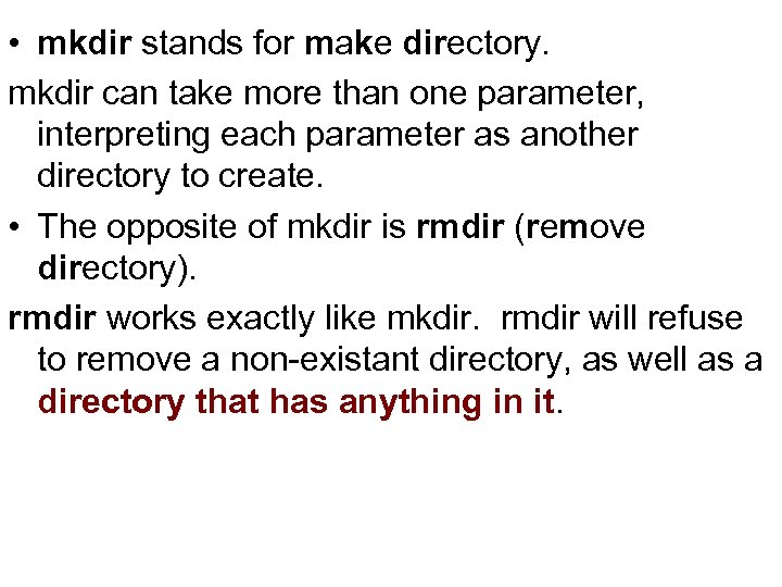 • mkdir stands for make directory. mkdir can take more than one parameter, interpreting each parameter as another directory to create. • The opposite of mkdir is rmdir (remove directory). rmdir works exactly like mkdir. rmdir will refuse to remove a non-existant directory, as well as a directory that has anything in it.
