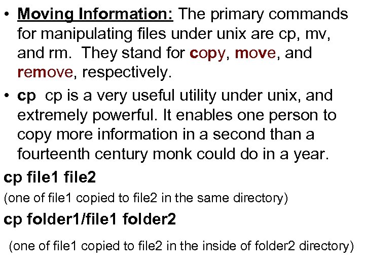• Moving Information: The primary commands for manipulating files under unix are cp, mv, and rm. They stand for copy, move, and remove, respectively. • cp cp is a very useful utility under unix, and extremely powerful. It enables one person to copy more information in a second than a fourteenth century monk could do in a year. cp file 1 file 2 (one of file 1 copied to file 2 in the same directory) cp folder 1/file 1 folder 2 (one of file 1 copied to file 2 in the inside of folder 2 directory)
