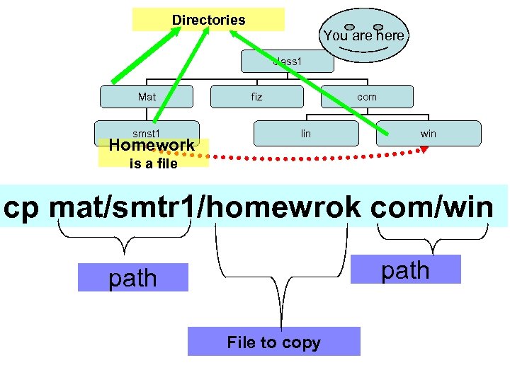 Directories You are here class 1 Mat smst 1 Homework fiz com lin win is a file cp mat/smtr 1/homewrok com/win path File to copy