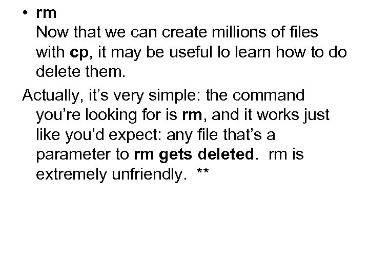 • rm Now that we can create millions of files with cp, it may be useful lo learn how to do delete them. Actually, it’s very simple: the command you’re looking for is rm, and it works just like you’d expect: any file that’s a parameter to rm gets deleted. rm is extremely unfriendly. **