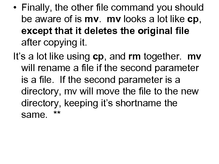 • Finally, the other file command you should be aware of is mv. mv looks a lot like cp, except that it deletes the original file after copying it. It’s a lot like using cp, and rm together. mv will rename a file if the second parameter is a file. If the second parameter is a directory, mv will move the file to the new directory, keeping it’s shortname the same. **