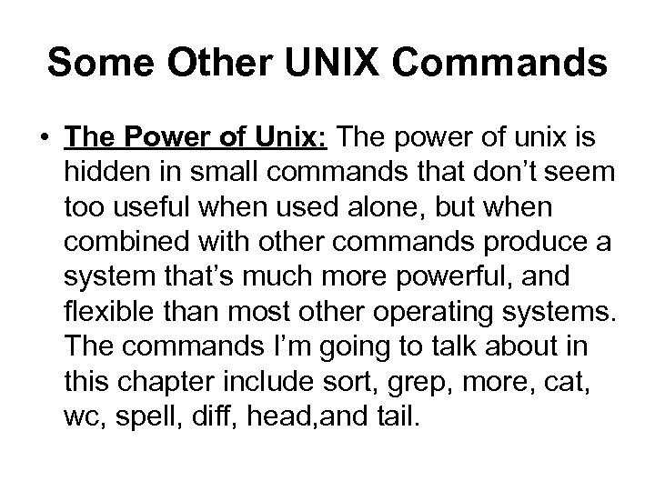 Some Other UNIX Commands • The Power of Unix: The power of unix is hidden in small commands that don’t seem too useful when used alone, but when combined with other commands produce a system that’s much more powerful, and flexible than most other operating systems. The commands I’m going to talk about in this chapter include sort, grep, more, cat, wc, spell, diff, head, and tail.