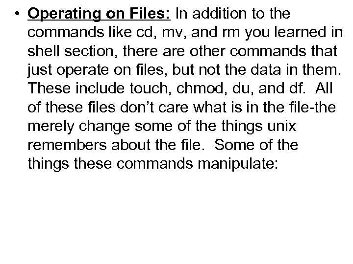 • Operating on Files: In addition to the commands like cd, mv, and rm you learned in shell section, there are other commands that just operate on files, but not the data in them. These include touch, chmod, du, and df. All of these files don’t care what is in the file-the merely change some of the things unix remembers about the file. Some of the things these commands manipulate: