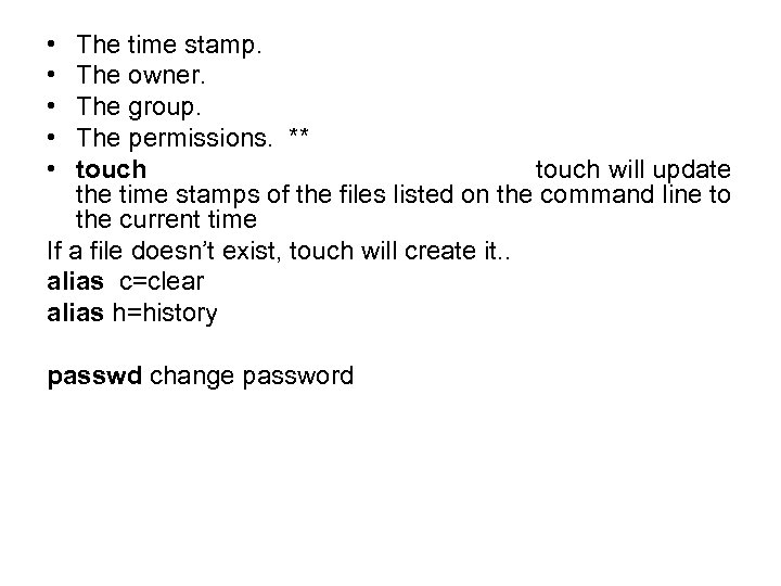 • • • The time stamp. The owner. The group. The permissions. ** touch will update the time stamps of the files listed on the command line to the current time If a file doesn’t exist, touch will create it. . alias c=clear alias h=history passwd change password