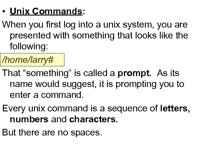 • Unix Commands: When you first log into a unix system, you are presented with something that looks like the following: /home/larry# That “something” is called a prompt. As its name would suggest, it is prompting you to enter a command. Every unix command is a sequence of letters, numbers and characters. But there are no spaces.