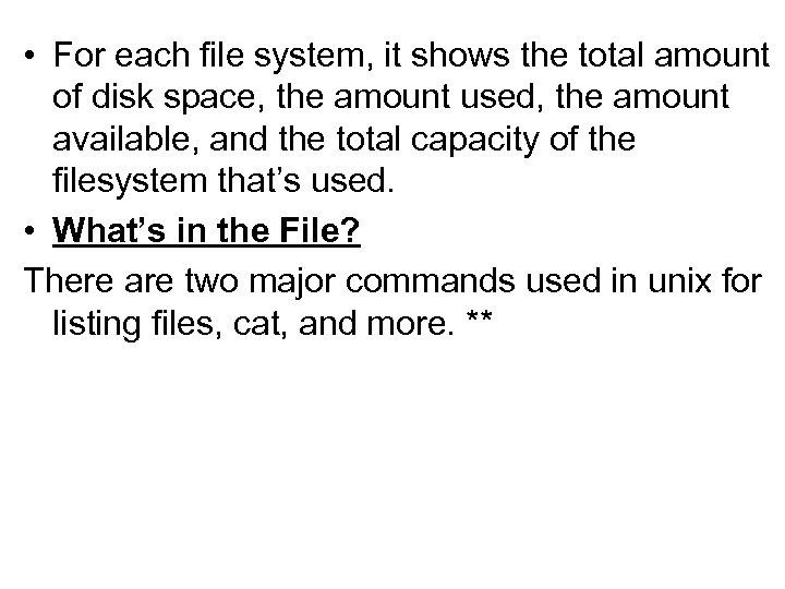 • For each file system, it shows the total amount of disk space, the amount used, the amount available, and the total capacity of the filesystem that’s used. • What’s in the File? There are two major commands used in unix for listing files, cat, and more. **