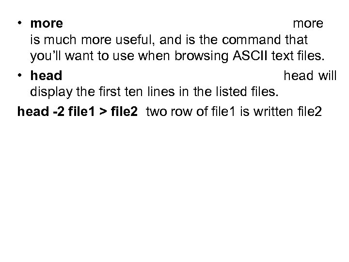 • more is much more useful, and is the command that you’ll want to use when browsing ASCII text files. • head will display the first ten lines in the listed files. head -2 file 1 > file 2 two row of file 1 is written file 2