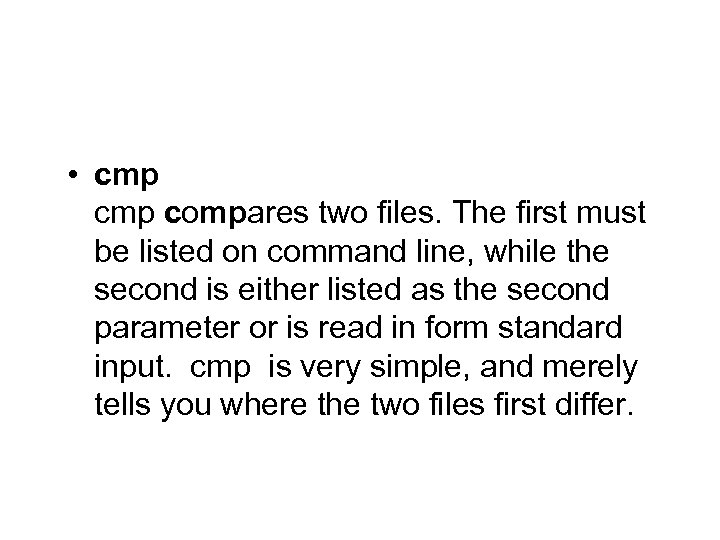 • cmp compares two files. The first must be listed on command line, while the second is either listed as the second parameter or is read in form standard input. cmp is very simple, and merely tells you where the two files first differ.