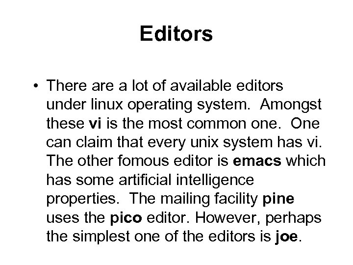 Editors • There a lot of available editors under linux operating system. Amongst these vi is the most common one. One can claim that every unix system has vi. The other fomous editor is emacs which has some artificial intelligence properties. The mailing facility pine uses the pico editor. However, perhaps the simplest one of the editors is joe.