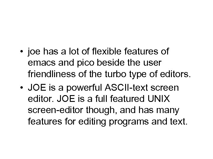• joe has a lot of flexible features of emacs and pico beside the user friendliness of the turbo type of editors. • JOE is a powerful ASCII-text screen editor. JOE is a full featured UNIX screen-editor though, and has many features for editing programs and text.