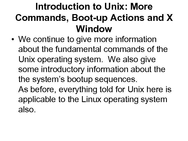 Introduction to Unix: More Commands, Boot-up Actions and X Window • We continue to give more information about the fundamental commands of the Unix operating system. We also give some introductory information about the system’s bootup sequences. As before, everything told for Unix here is applicable to the Linux operating system also.