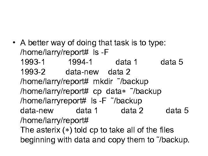 • A better way of doing that task is to type: /home/larry/report# ls -F 1993 -1 1994 -1 data 5 1993 -2 data-new data 2 /home/larry/report# mkdir ˜/backup /home/larry/report# cp data ˜/backup /home/larryreport# ls -F ˜/backup data-new data 1 data 2 data 5 /home/larry/report# The asterix ( ) told cp to take all of the files beginning with data and copy them to ˜/backup.