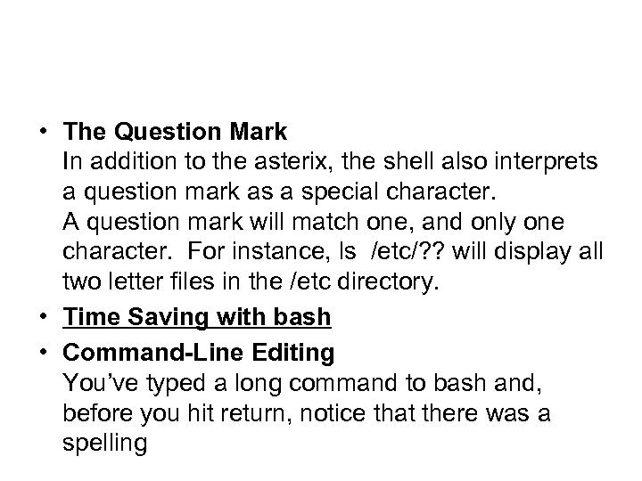 • The Question Mark In addition to the asterix, the shell also interprets a question mark as a special character. A question mark will match one, and only one character. For instance, ls /etc/? ? will display all two letter files in the /etc directory. • Time Saving with bash • Command-Line Editing You’ve typed a long command to bash and, before you hit return, notice that there was a spelling