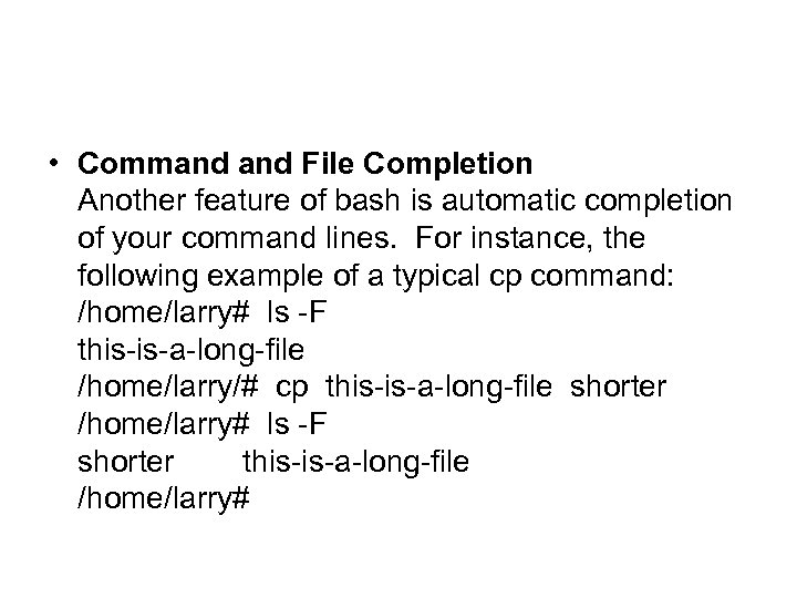 • Command File Completion Another feature of bash is automatic completion of your command lines. For instance, the following example of a typical cp command: /home/larry# ls -F this-is-a-long-file /home/larry/# cp this-is-a-long-file shorter /home/larry# ls -F shorter this-is-a-long-file /home/larry#